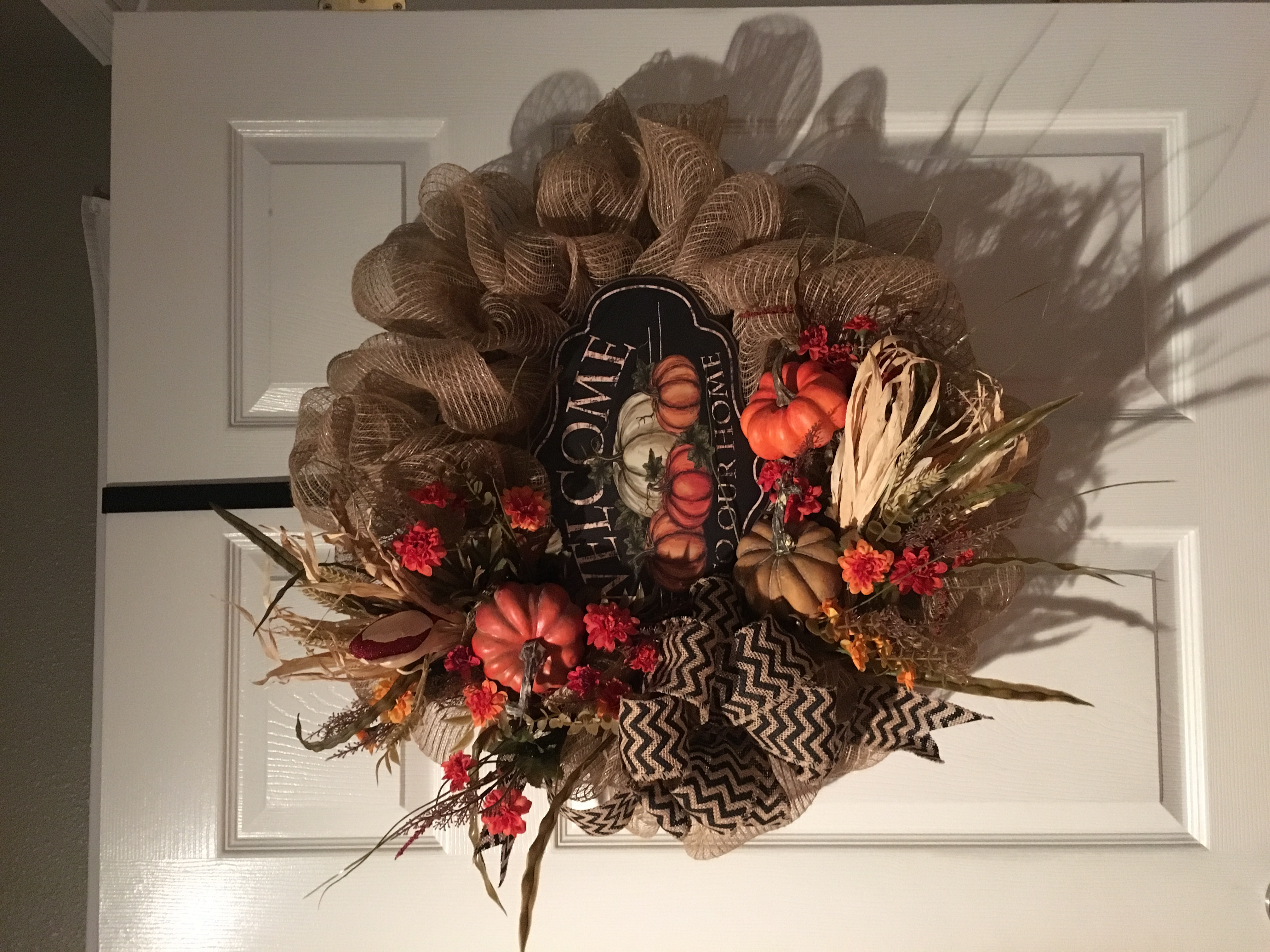Beautiful fall wreath, on 18" wired wreath form, 24" in diameter. Made with jute tan deco mesh, pumpkins and charming fall flowers as accents.